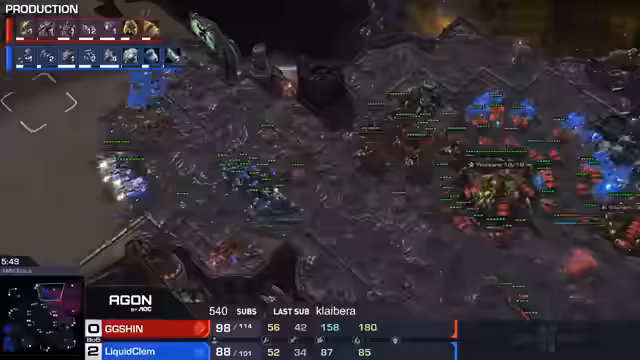 02:58:14Shin gegen Gumiho startet mit einem Zweirex Opening. Gumiho ist rechts oben in blau, Shin links unten in rot. Der Streamer erwartet eine lange Serie, da beide Spieler sehr makroorientiert sind. Shin wird von Reapers angegriffen. Die Addons sind ungünstig platziert. Shin drückt Speed anstatt eines Nidus. Er hat kein Tech-Lab und kommt mit Marines und Reapern rüber. Gumiho baut Roaches und Queens. Der Streamer glaubt nicht, dass Shins Non-Stim-Marines etwas ausrichten können. Shin möchte sich Zeit kaufen und Gumiho zieht voll durch. Stimpack ist noch nicht fertig. Der Bunker ist nicht ready und wird zerstört. Der Drop ist nervig, aber nicht genug. Shin gewinnt das Spiel mit 1:0.