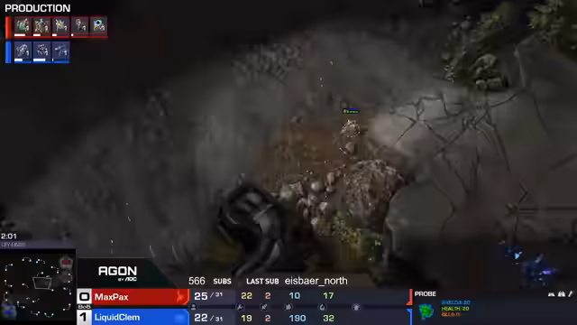 00:23:12Der Stream startet und präsentiert das Playoff-Duell zwischen Solar und Shin. Kommentiert wird der ungewöhnliche Umstand, dass Shin entgegen seiner gewohnten Zerg-Rasse diesmal Protoss spielt, was zu einem PvZ anstatt des erwarteten ZvZ führt. Die Spawnpunkte der Spieler werden mit Solar links oben in Rot und Shin rechts unten in Blau benannt. Der Kommentator äußert seine Überraschung und spekuliert über die möglichen Gründe für Shin's Rassenwechsel.