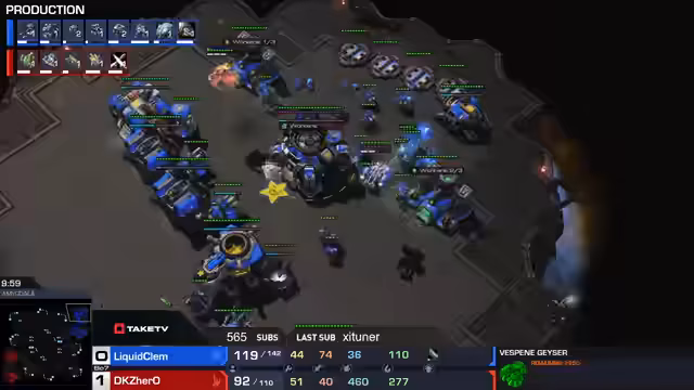 04:00:29Das Finale beginnt mit einem Best-of-Five zwischen den Spielern SOLAR und SHIN auf einem Custom Map. SOLAR startet mit einer Adapt-Strategie, die jedoch ins Stocken gerät, als SHIN, der als Terraner agiert, mit Reaper und Hellion aggressiv vorgeht. SOLAR verliert dabei mehrere Worker und gerät in eine schwierige Lage, da seine dritte Base stark unter Druck steht und seine Armeestärke reduziert ist. Kommentiert wird, dass SOLAR dringend Hilfe benötigt, die jedoch zu spät kommt, und die Situation für ihn katastrophal ist.
