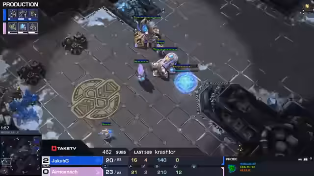 01:00:16Jakub setzt seine dominante Leistung im vierten Spiel fort. Airneanach versucht es erneut mit einer defensiven Forge-Bauweise, doch Jakubs ständiger Druck führt dazu, dass Airneanach nie in das Spiel kommt. Trotzdem gewinnt Airneanach überraschend das fünfte Spiel und verkürzt auf 2 zu 2. Im sechsten Spiel setzt Jakub mit aggressivem Druck durch und sichert sich mit einem 3 zu 2-Sieg die Series. Anschließend wechselt der Stream zum nächsten Match zwischen Moya und Foxer in einem Terran-vs.-Terran-Duell.