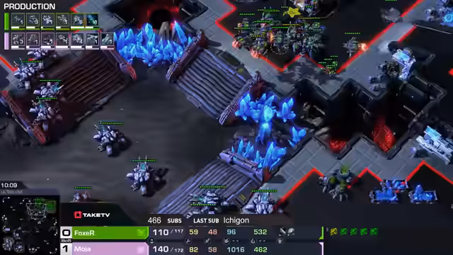 01:33:34Foxer befindet sich in einer kritischen Lage mit einem deutlichen Army-Supply-Nachteil von 110 zu 76 gegen Moja. Er ist auf drei laufende Basen verteilt, kann aber keinen Durchbruch erzielen. Sein Gegner Moja hat massiv Panzer in der Rückendecke und verteidigt erfolgreich. Foxers Armee ist nicht mobil genug, um effektiv zu agieren, und der Kommentator hält eine Niederlage für unausweichlich, da er mit der vorhandenen Army gewinnen müsste, um im Spiel zu bleiben.