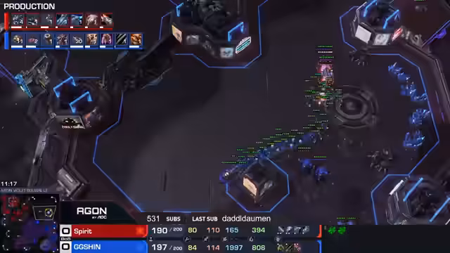 00:25:19Die erste Partie zwischen Shin und Spirit auf der Map Neon Violet Square beginnt. Kommentiert wird, dass Spirit als sehr defensiver Zergspieler bekannt ist und sich auf Harassment und Map Control konzentriert, während Shin aggressiver agieren möchte. Spirit etabliert früh eine stabile Wirtschaft mit vielen Command Centers, während Shins Angriffe, insbesondere mit Roaches und später Banelings, von Spirit erfolgreich abgewehrt werden.