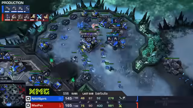 00:52:47Spirit verteidigte sich erfolgreich gegen die anfängliche Stalker-Offensive von MaxPax und verursachte minimalen Schaden. Seine Defensive mit Bunkern und Panzern funktionierte gut, sodass MaxPax seine Einheiten aus der Offensive abziehen musste. Spirit nutzte diese Phase, um seine Wirtschaft aufzubauen und sein drittes Command Center zu errichten. MaxPax konterte mit dem Bau eines Reaktors am Starport, um die Produktion weiterer Medivacs zu blockieren, und baute gleichzeitig vierte Basis aus. Der Kommentator hob hervor, dass MaxPaxs Erfahrung dabei half, Spirit in Schach zu halten, obwohl Spirit mit einer stärkeren Army begann, die durch Run-Bys und ständige Harassment-Attacken von MaxPax aus dem Gleichgewicht gebracht wurde.