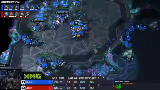 01:03:39Nachdem das erste Match mit einem 1:0 für MaxPax endete, begann das zweite Match im Best-of-Three zwischen MaxPax und Sauen auf der Map Side Delta. Diesmal war MaxPax links oben in blau und Sauen rechts oben in rot gelandet. Der Kommentator vermerkte, dass MaxPax erneut eine typische Proxy-Gate-Strategie spielte, was Sauen mit einer provokativen Probe in der Basis des Gegners konterte. Während dieses Mappings wurden im Chat monatliche Unterstützer erwähnt und auf anstehende Events wie den Homestory Cup Qualifier hingewiesen, der am Samstag stattfinden wird.