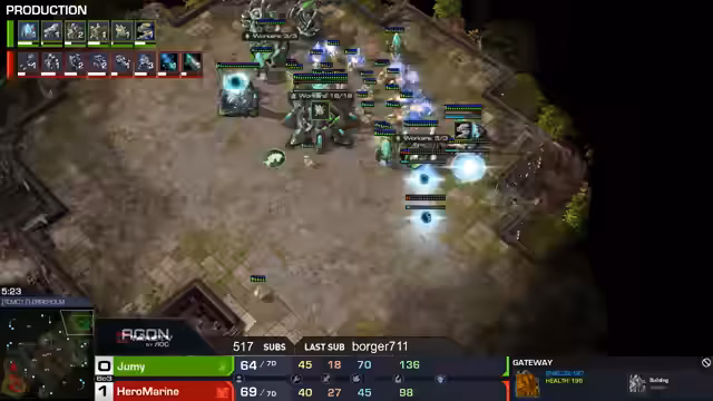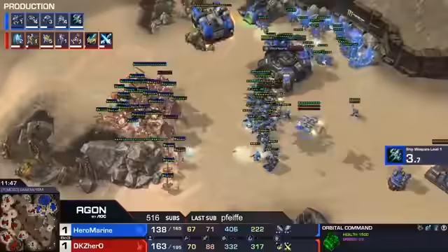 00:10:18Der Fokus liegt auf dem TVP-Match zwischen Hero Marine (Terraner) und Hero (Protoss). Hero Marine, als makroorientierter Spieler bekannt, beginnt aggressiv. Nach einem frühen Hellion-Harassment ist Hero Marine mit nur vier Arbeitern in Front zurück, was als suboptimal bewertet wird. Hero antwortet mit Phoenixen und Kolossen. Trotzdem gelingt es Hero Marine ein starkes Timing zu nutzen, mit Tank, Cyclone und Marines ein entscheidendes Engagement zu gewinnen und das Spiel mit 2:0 für sich zu entscheiden.