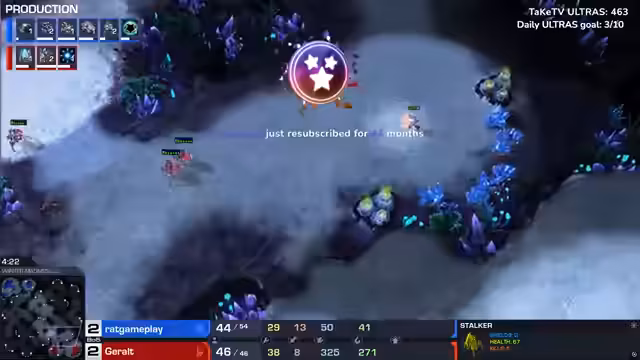 00:42:35Nach technischen Schwierigkeiten mit Stream-Elementen geht es zur ersten Map. Geralt agiert offensiv, verliert aber Stalker und Arbeiter. Mana nutzt seine 1-Gate-Expedition und einen besseren Worker-Vorteil (13 Arbeiter mehr), um einen entscheidenden Vorteil aufzubauen. Geralt versucht mit Dark Templars, doch Mana hat Detection durch ein Orakel. Geralt gibt auf und Mana gewinnt die erste Map, was den Stand auf 1:0 setzt.