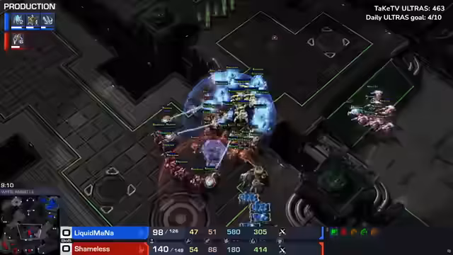 03:07:32Die Serie wechselt zum Protoss-Duell zwischen Shameless und Mana. Shameless setzt auf frühes Stargate-Play und ein Proxy-Gateway, während Mana defensiv mit Immortal und Templar Archives antwortet. Nach intensiven Kämpfen gewinnt Shameless das erste Spiel durch überlegene Armee-Kontrolle und Einheitenvorteil. Die Zuschauerstatistik zeigt ein überwiegend reiferes Publikum (Durchschnittsalter 35-44 Jahre), was diskutiert wird.