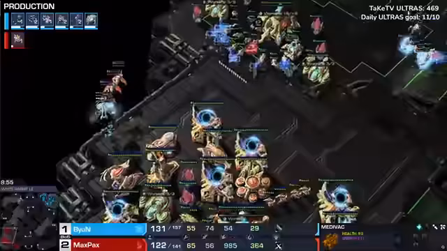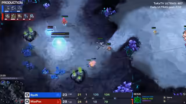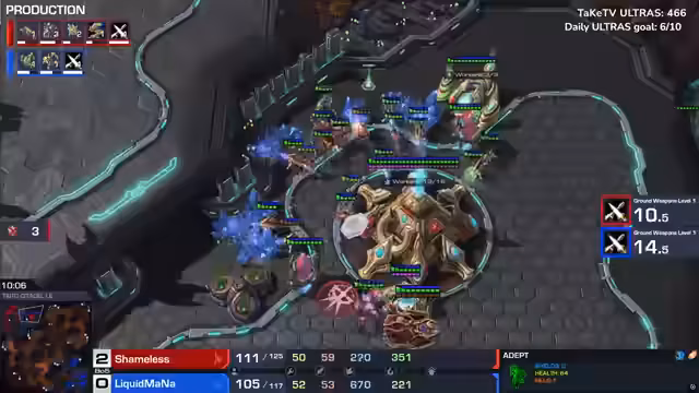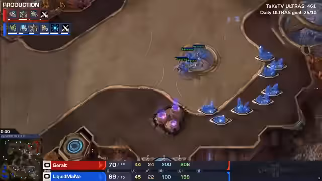 01:25:39Geralt startet erneut mit einem Proxy-Pylon und Twilight-Council-Blink, doch Mana spielt defensiv mit einer eingewohnten Expansion. Geralt drängt mit Adepts und Immortals, doch Mana nutzt Halluzinationen und eine starke Ökonomie (10 Arbeiter mehr). Trotz Geralts Run-By-Versuchen und Dark Templar hält Mana mit Kanonen und Batterien stand. Geralt verliert seine Armee und gibt auf. Mana gewinnt die Serie 3:2 und qualifiziert sich für das nächste Match gegen Yusamil.