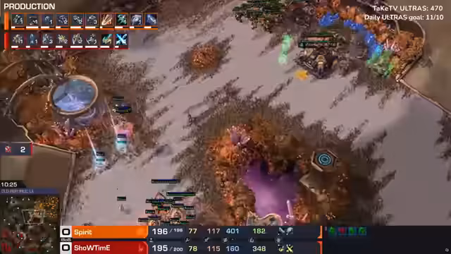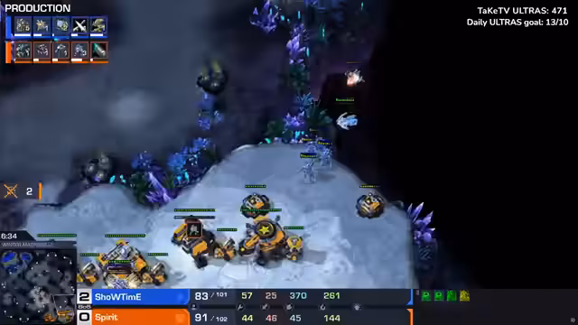06:04:49Nach einer Unterbrechung beginnt Map 3 mit Spirit als Terraner in Orange und Showtime als Protoss in Blau. Spirit riskiert ein schnelles Orbital mit SCV-Verlust, während Showtime adepts scoutet. Ein Medivac-Drop von Spirit verursacht ökonomischen Schaden, kostet aber wichtige Einheiten. Für 4 Stalkers verliert Spirit 16-20 Arbeiter, was als monumentaler Schaden bewertet wird. Showtime nutzt Forcefields, aber Spirit's Map-Kontrolle und Air-Einheiten dominieren.