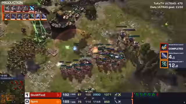 05:58:53Showtime startet eine massive Offensive mit Gate-Pair-Einheiten und Zealots, während Spirit seine Basen aufgibt. Mit drei Kolossen gleichzeitig stabilisiert Showtime seine Position und erzwingt Spirit's Rückzug. Showtime erreicht eine dominante Wirtschaft mit vier bis sechs Basen und gewinnt die zweite Map, was zu einem 2:0-Führungsstand im Best-of-5 führt. Spirit zeigt Frustration, verlässt die Lobby und zeigt sich für die nächste Map nicht bereit.