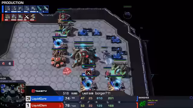 01:09:42Cure greift erneut an und kann Bunnys Arbeiter dezimieren. Bunny kontert mit Vikings, die Cures Starport angreifen. Cure hat ein Upgrade-Vorteil und kann Bunny zurückdrängen. Bunny verteidigt einen Matchpoint und hält das Spiel offen. Im sechsten Spiel analysiert der Streamer die Planetary Fortress und ihre defensive Stärke. Cure hat einen Upgrade-Vorteil und eine stärkere Wirtschaft, was ihm eine gute Ausgangslage verschafft. Bunny greift mit Vikings und Liberator an, was Cures Panzer unter Druck setzt. Cure kann den Angriff abwehren, verliert aber Produktionsgebäude. Bunny gleicht die Upgrades aus und greift erneut an, was Cure in Bedrängnis bringt. Der Streamer analysiert die Truppenbewegungen und Upgrade-Vorteile beider Spieler und kommt zu dem Schluss, dass Cure aufgrund seiner Panzer und Upgrades im Vorteil ist. Bunny hat mehr Marines, kann aber gegen Cures Panzer wenig ausrichten.