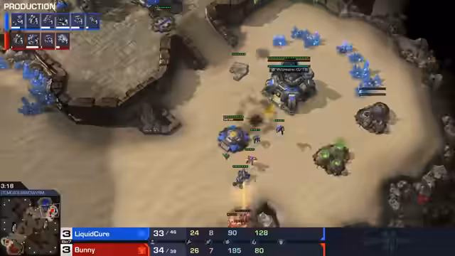 01:17:38Cure steht vor großen Herausforderungen in diesem Match, besonders wenn er den aktuellen Kampf nicht gewinnt. Trotz eines Vorteils von 9 gegen 5 Panzern, sind seine 97 Marines wenig wert, wenn sie keine ausreichende Unterstützung von den Panzern erhalten. Bunny nutzt die Situation aus und fügt Cure schwere Verluste zu, während Cure Schwierigkeiten hat, neue Basen zu errichten. Bunny nervt Cure immer wieder mit kleinen Angriffen und hält Cure davon ab, sich zu stabilisieren. Cure versucht zwar, mit einem Planetary Fortress gegenzuhalten, aber Bunny kann dies leicht kontern. Bunny profitiert von seiner besseren Positionierung und nutzt die Topographie der Karte, um Cure weiter unter Druck zu setzen. Bunny kann seine Panzer von einer Klippe aus unterstützen lassen und so die Planetary Fortress und Marines von Cure angreifen, ohne selbst in Gefahr zu sein. Cure erkennt schließlich seine aussichtslose Lage und gibt auf, was zu einem 3:3 führt und einen siebten Mapper erzwingt.