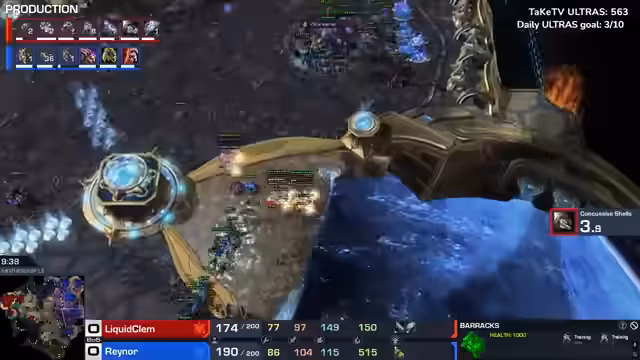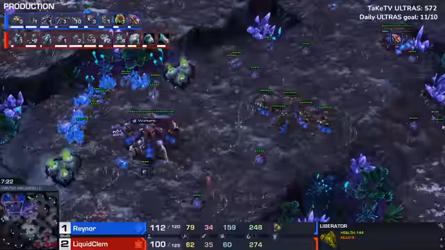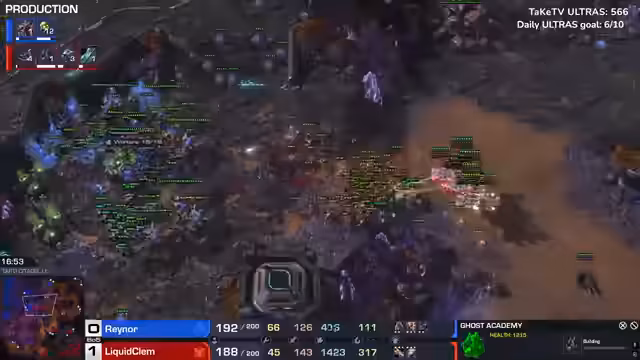 03:30:56Clem startet einen Helmet-Push mit Armory und Liberator. Raynor reagiert mit Queens und Spore Crawlern, doch die Liberator kann nur begrenzten Schaden anrichten. Raynor verliert drei Queens und mehrere Dronen, während die Spore Crawler zu spät platziert werden. Der Liberator wird von Queens bedrängt, erreicht aber sein Ziel nicht rechtzeitig. Die Diskussion thematisiert, dass Clem eine zweite Factory baut und Drilling Claws erforscht, während Raynor eine Makro-Hatchery plant und Hydras baut.