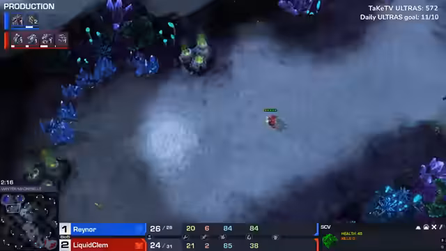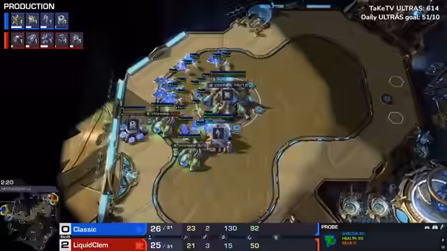 02:15:29Clem geht mit einer starken Offensiven aus Liberatorn, Marines und Tanks vor. Max-Pax versucht, mit Kolossen und Stalkern zu kontern, scheitert aber an Clems präziser Armee-Kontrolle. Ein entscheidender Run-by mit Einheiten wird durch Biosupport abgewehrt. Clem dominiert den Druck, zerstört Basen und erzwingt schließlich den Sieg. Die Kommentatoren betonen Clems Fähigkeit, selbst unter Druck perfekt zu reagieren und seine strategische Überlegenheit im späten Spiel.