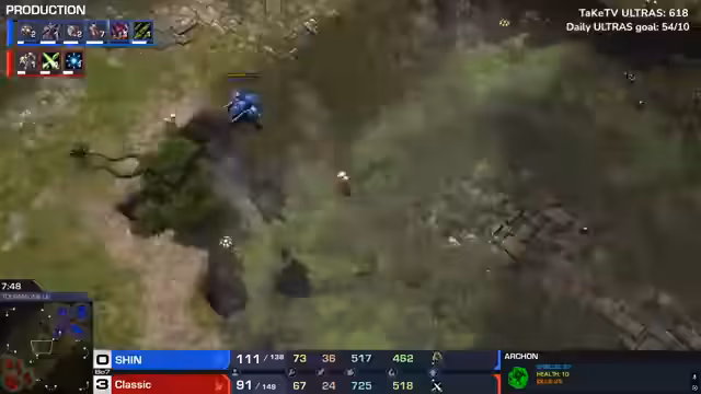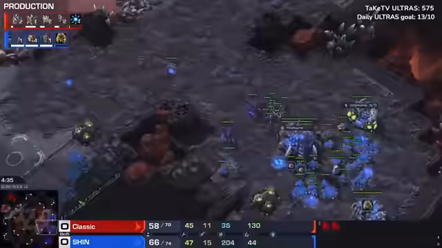 04:07:18Shins Nickname 'Shintos' wird humorvoll kommentiert, und ein Zergling-Skin wird als visuell verwirrend kritisiert. Shin startet mit Hedgeblock (Drohne) gegen Classics Reaper-Opening. Ein früher Orakel-Angriff von Classic scheitert an Spore Crawlern und Queens, und Shin rasiert Classics Basis nach Verlust eines Pytons. Classic gibt bei 0:2 im Best of Five auf, wodurch Shin ins Grand Final vorrückt.