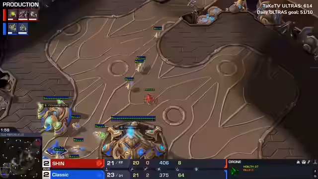 04:10:26Das Best of Five beginnt mit Shin als Zerg (Brood War Drohnen-Skin) gegen Classics Protoss. Shin expandiert zur dritten Basis mit Stargate und Orakel, doch ein früher Adept-Angriff wird von Spore Crawlern geblockt. Shin verliert eine Queen, aber Queens und Spore Crawler verteidigen erfolgreich. Sub-Bomben überfüllen den Chat, während Shin Classics Pylon zerstört und den Warp-In verhindert. Classic gibt auf, und Shin führt 2:0.