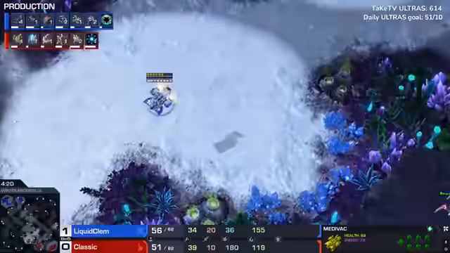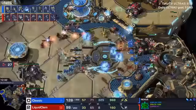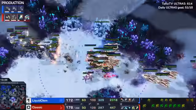 06:19:57In einer intensiven Partie zwischen Clem (Terraner) und Classic (Protoss) zeigt Classic seine Stärke in der Wirtschaft und Armee操控. Trotz Cles guter Defensivpositionen und Liberator-Einsätzen dominiert Classic mit Kolossen, Immortalen und Stalkern. Clems verbleibende Einheiten, darunter Vikings, reichen nicht aus, um den Vormarsch zu stoppen. Classic erzielt einen klaren Sieg, indem er Cles Produktion zerstört und dessen Wirtschaft ruiniert. Dieser Sieg festigt Classics Position im Grand Final und verhindert ein Rematch gegen Shin.