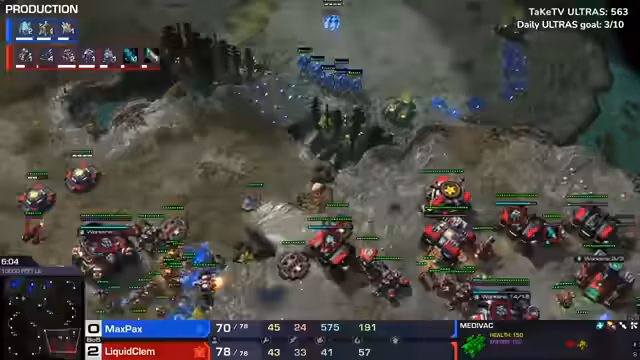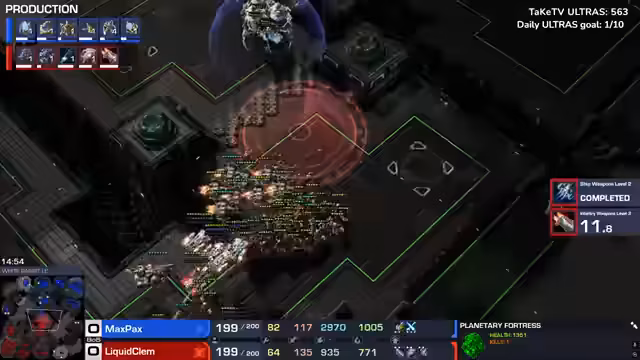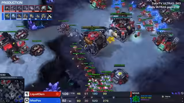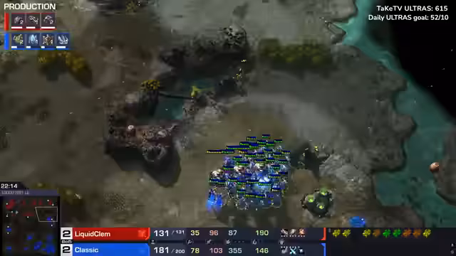 01:47:22Clem nutzt Liberatorn mit Advanced Ballistics, um Max-Pax' Protoss-Armee unter Druck zu setzen. Die Positionierung der Liberatorn macht es für Stalker und Kolosse unmöglich, effektiv anzugreifen. Es wird diskutiert, dass Max-Pax ohne Tempests keine Chance gegen Clems Armee hat. Clems Kontrolle ist so überlegen, dass selbst professionelle Spieler gegen ihn kaum bestehen können, was als Ausdruck seiner außergewöhnlichen Skills gewertet wird.