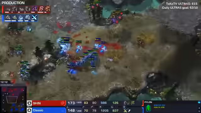 06:55:57Classic gewinnt die erste Map durch exzellente Kontrolle und Wirtschaftsführung. Shin versucht mit Mutas und Roaches zu kontern, aber Classics Armee mit High Templar, Storms und Immortalen schlägt alle Angriffe zurück. Shin bleibt trotz 0:1-Rückstand aggressiv, doch Classics Makro-Skills und Einheitenmikrokontrolle sind überlegen. Shin's Versuche, mit Neural Parasite und Ultras zu kontern, scheitern an Classics gut positionierten Einheiten. Die Kommentatoren betonen, dass Shin's bisherige Stärke (Ungeschlagenheit im Turnier) nun auf eine harte Probe gestellt wird.