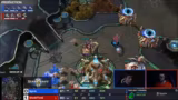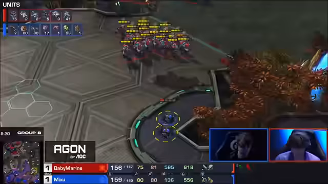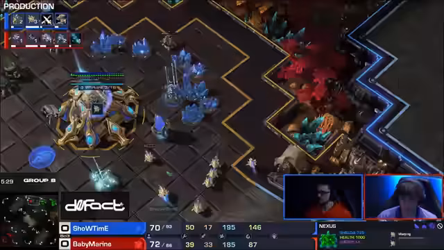 03:47:38Die direkte Begegnung beginnt mit einem normalen Öffner von beiden Spielern. Showtime wählt einen Adapten-Opener, während Babymarine eine Medivac-Drohne gegen Showtime's Hauptbasis startet. Kommentatoren analysieren die Verteidigung von Babymarine und die Drucktaktik von Showtime. Es entwickelt sich ein ständiges Minigame aus Harassment, Verteidigung und Gegenangriffen, bei dem beide Spieler versuchen, den anderen zu provozieren und Fehler zu erzwingen.