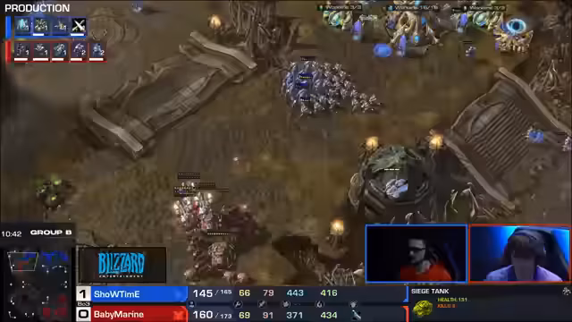 03:52:05In einer kritischen Phase des Spiels startet Babymarine einen großen Angriff mit Zealoten, um Showtimes Stellungen zu destabilisieren. Showtime verteidigt jedoch äußerst effizient und zerstört Babymarines Armee vollständig. Kommentatoren beschreiben diesen Kampf als brutal und saubere Ausführung durch Showtime, der den Spielverlauf endgültig zu seinen Gunsten entscheidet. Sie sehen darin einen typischen Fehler von Protoss-Spielern in der Mid-Game-Phase.