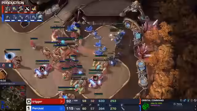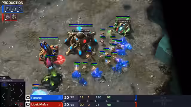 01:01:11Während des Percival-gegen-MaNa-Matches konzentriert sich der Kommentar auf die unterschiedlichen Spielstile. Percival als Terraner zeigt gutes Makro- und Expansionsverhalten, aber Schwächen in Midgame-Entscheidungen und Kampfführung. MaNa als Protoss nutzt aggressive Pushes mit Chargelots und Immortals, doch Percival verteidigt erfolgreich mit Liberator-Support und Bio-Einheiten. Es wird diskutiert, dass Percivals unentschlossene Offensiven sein größtes Handicap sind, obwohl seine ökonomische Basis solide ist.