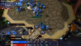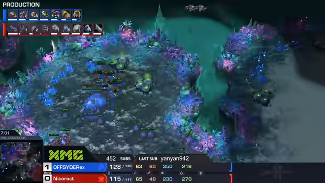 01:17:26NICORACT startet einen massiven Angriff mit einer großen Armee aus Marines, Tanks und Banes. Rex muss seine schwindende Economy verteidigen. Kommentator beschreibt den Kampf als intensiv und chaotisch, vergleichbar mit dem Film Starship Troopers. Währenddessen baut Rex kontinuierlich neue Einheiten nach. Der Ausgang hängt davon ab, ob Rex es schafft, NICORACTs Ansturm aufzuhalten und seine Wirtschaft zu retten oder ob NICORACT den Game in die Länge zieht und am Ende gewinnt.