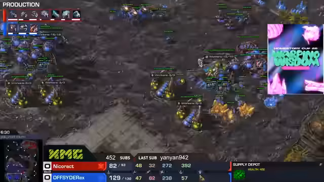 00:28:30Das Eröffnungsspiel zwischen ByuN und NICORACT ist ein Terraner gegen Terraner (TVT) auf der Map Habitation Station. NICORACT wählt ein aggressives 1-1-1-Opening mit Starport und Liberatoren, um ByuN unter Druck zu setzen. ByuN verteidigt jedoch erfolgreich, erkennt die aggressive Strategie und zwingt den Gegner zurück. Nachdem NICORACT den ersten Angriff verliert, wechselt das Spiel in eine makroorientierte Phase, in der beide Spieler ihre Basen ausbauen und Armeen aufbauen. Kommentator hebt ByuNs kontrolliertes Spiel und seine effektive Verteidigung hervor.