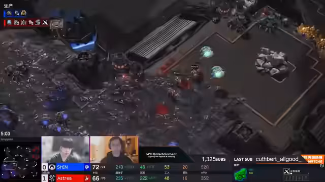 01:14:15Im zweiten Match zwischen Estrella und Shin zeigt Estrella eine konstant starke Leistung. Shin hingegen wirkt in der Kamera unglücklich und ist defensiv unterwegs. Es gelingt ihm nicht, Estrellas Vormachtstellung in Frage zu stellen. Obwohl beide Spieler drei Basen erreichen, hat Estrella stets einen klaren Vorteil in der Economy und der Armee-Stärke. Der erste Satz geht mit 0-2 an Estrella. Shin gelingt es im zweiten Satz nicht, ein Game zu gewinnen, und verliert auch dieses Match 0-2.