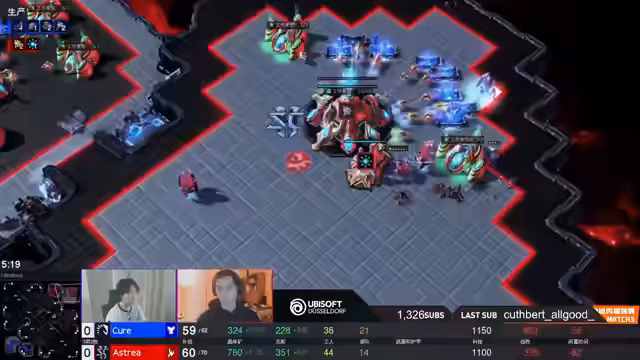 02:12:58Die zweite Map Laylines beginnt mit einer erneuten Führung für Astraea. Cure, der diesmal im Terraner-Setup TVP spielt, agiert unentschlossen und verschafft Astraea einen entscheidenden Vorteil. Trotz eines erfolgreichen Comebacks von Cure, das ihn kurz vor einem Ausgleich bringt, führt der frühere wirtschaftliche Nachteil am Ende zum Mapverlust für ihn und zum 2-0 für Astraea.