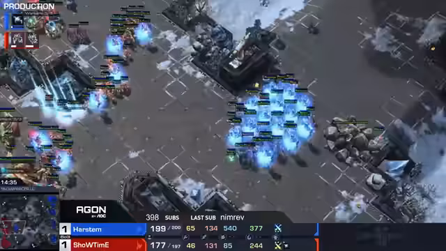 01:39:16Unmittelbar nach dem ersten Match beginnt die nächste Partie zwischen Showtime und Harstem. Auf der Map Antiga Shipyard zeigt Harstem eine aggressive Strategie mit Proxy-Robo und Phoenix-All-in, die jedoch von Showtime erfolgreich verteidigt wird. Harstem kann seine vierte Basis nicht halten und unterliegt damit klar mit 0:1 in dieser Serie. Showtime steht damit mit 3:1 sehr gut in der Turniertabelle.