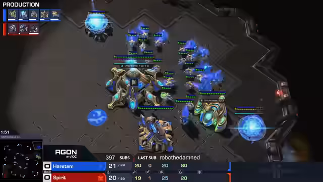 01:01:07Showtime übernimmt die Führung mit fünf Basen, während Spirit vier Basen hält. DT Blink kommt ins Spiel. Der Streamer erwähnt Probleme mit seinem WLAN, was die Bedienung seiner Elgato-Lights beeinträchtigt. Ein Push von Showtime wird abgewehrt. Es wird über verschiedene Upgrade-Strategien gesprochen. Der Streamer erklärt, dass DTs durch Sensortürme sichtbar werden, wenn Detection vorhanden ist. Salad Runbys setzen Spirit zu, während dieser mit seiner Armee unterwegs ist und eine Nuke vorbereitet. Showtime hat 42 Worker gegenüber 64 von Spirit, was ihm einen Vorteil verschafft. Er spielt einen Base-Trade, bei dem es darum geht, die gegnerische Produktion zu zerstören. Disruptoren spielen eine wichtige Rolle, da sie großen Schaden anrichten können, wenn sie treffen. Der Streamer vermutet einen fliegenden Boy von Spirit, ist sich aber nicht sicher, ob dieser ihn retten kann.