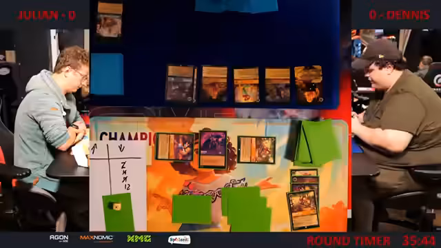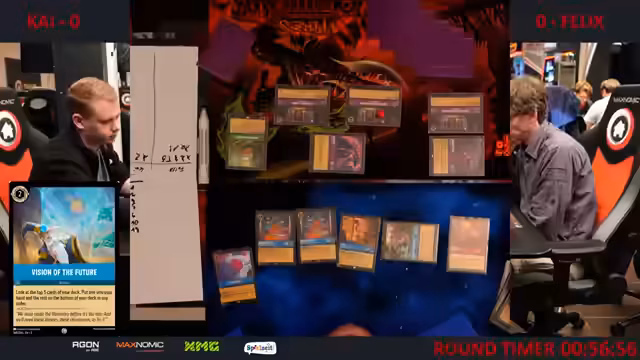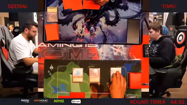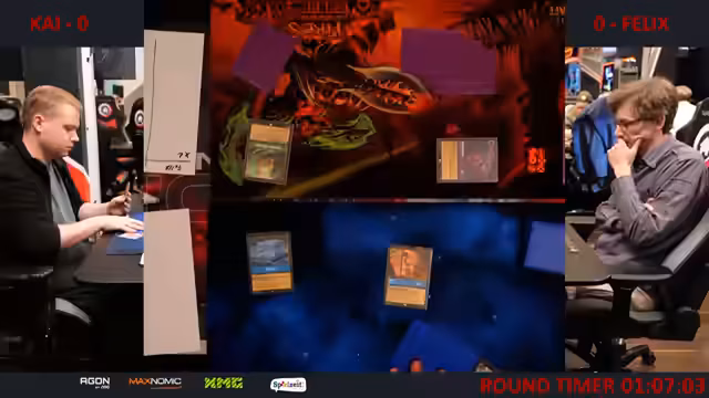 07:50:03Der Judge informiert über eine Regeländerung: Sollte nach fünf zusätzlichen Zügen kein Spieler 20 Lore erreichen, gewinnt der Spieler mit der höheren Lore-Anzahl. Kai muss in drei Zügen 18 Lore erreichen und gleichzeitig Felix daran hindern, 4 Lore zu generieren. Felix' Sisu wird entfernt, und er zieht eine Karte. Die Kommentatoren analysieren Kais Chancen und Felix' mögliche Züge. Felix setzt Kit ein, um Kais Lore-Sammlung zu behindern. Nach einer Diskussion gewinnt Felix das Match mit 2:1, trotz Kais starkem Kampf. Die anderen Ergebnisse werden kurz erwähnt, und eine Pause wird angekündigt, bevor es mit den nächsten Spielen weitergeht. Es wird erwartet, dass Xana gegen MSP spielt, und die Vorbereitungen für die nächste Runde laufen.