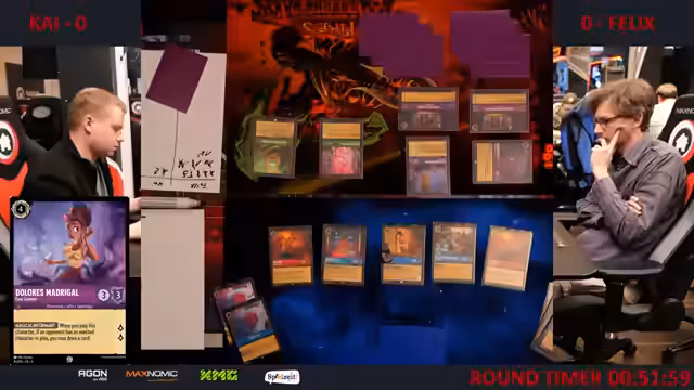 06:37:03Der Live-Kommentar beginnt mit der Vorstellung der Spieler Kai und Felix, die im Top 8 gegeneinander antreten. Kai spielt ein blau-rotes Deck, während Felix ein lila-grünes Deck spielt. Der Anfang des Spiels wurde verpasst, aber es wird schnell festgestellt, dass Kai Tipo für Ramp einsetzt und Felix Madame Mim Schlange spielt. Es wird sichergestellt, dass alle wichtigen Informationen wie Siegpunkte und Boardstate im Stream sichtbar sind. Ein Rundentimer wird eingeblendet. Felix spielt Dolores Madrigal und das Maragd Chronomikon, das es ihm erlaubt, einen Charakter des Gegners auf dessen Hand zurückzuschicken, wenn einer seiner Charaktere verbannt wird. Kai spielt Maui in den Tinnenvorrat und setzt Xaver Hampelmann ein, um zwei Karten zu ziehen. Blau-Rot wird als eines der stärksten Decks im Meta beschrieben, das gut gegen Steelsong dasteht. Felix spielt das Schloss der Königin, das ihm zu Beginn seines Zuges zwei Legenden und eine zusätzliche Karte pro Charakter an diesem Ort gibt.