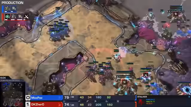 01:03:59Die fünfte Map, Vanilla, beginnt mit identischem Stargate-Build auf beiden Seiten, was zu einem ungewöhnlichen, langen Spiel ohne Feindkontakt führt. Der Kommentator spekuliert über die wahrscheinlichen nächsten Schritte. Die Entscheidung fällt nach einem massiven, ausgeglichenen Kampf mit Phoenixen, in dem Maxpex letztlich durch eine kluge Spielweise und mehr Truppen die Oberhand gewinnt und das gesamte Match mit 3-2 für sich entscheidet.