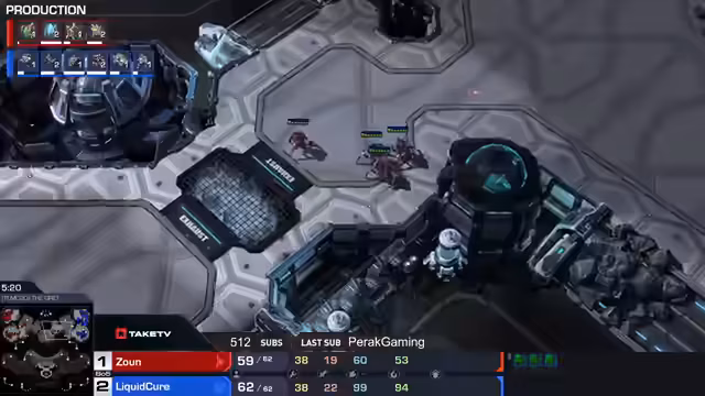 01:24:10Nach anfänglichen Scharmützeln entwickelt sich das Spiel zu einer Phase der Base-Race und Ressourcenkontrolle. Zaun mit fünf Basen und massiven Carrier-Production steht gegen Cure mit vier Basen und einer starken Bio-Armee unter Medivac-Schutz. Der Kommentar hebt hervor, dass Cure trotz des Gleichstands in Army Supply unter Druck gerät und seine Armeen oft im Kiting-Modus hält, während er auf den richtigen Moment für einen großen Schlag wartet.
