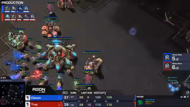 04:27:23Beobachtet wird eine sehr präzise taktische Fokussierung durch Trap, der es schafft, mit seinen Stalkern mehrere Medivaks effektiv zu splitzen und zu fokussieren. Dies zeigt ein hohes Maß an Micro-Kontrolle und die Fähigkeit, das Maximum aus seinen Einheiten herauszuholen. Die Aktion wird als sehr stark und effizient bewertet.