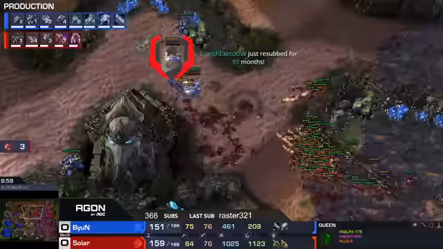 03:50:12Der Streamer entschuldigt sich für ein technisches Problem, bei dem sein Mikrofon stummgeschaltet war, und dankt einem Zuschauer für den Hinweis. Er erklärt, dass die aktuellen Spiele Replays sind, die zeitgleich mit anderen Partien liefen, deren Ergebnisse aber noch unbekannt sind. Solar steht aktuell mit 3-1 und einem Map-Score von +1 in der Gruppe. Es wird analysiert, dass Bjarne gegen Oliveira führt und Oliveira das Spiel wahrscheinlich aufgeben wird. Anschließend wird der Zuschauer Kerb für seine Unterstützung erwähnt. Es wird kurz über den Gesundheitszustand des Streamers gesprochen und ein Kommentar zu den LED-Lampen im Hintergrund gemacht. Die Analyse des Spiels zwischen Biann und Oliveira beginnt, wobei Oliveira einen guten Schaden verursacht und einen Worker-Vorteil erlangt. Trotzdem ist das Spiel noch nicht vorbei, da Biann aufholen kann.