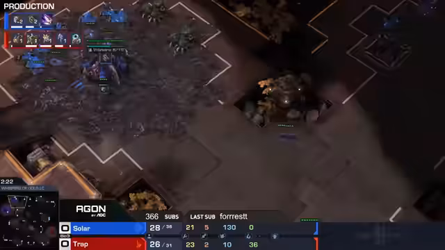 01:56:51Björn besiegt Solar in der ersten Partie, der Sieg wird als komfortabel beschrieben, da Björn Solar auseinanderschraubte und dessen Wirtschaft nicht mehr ausreichte. Der Spielstand steht 1:0 für Björn. Als nächste Map wird Amygdala für das nächste Spiel zwischen den beiden Spielern angekündigt. Auch das nächste Match-up, Biann gegen Solar, wird erwähnt, bei dem Björn bereits im ersten Satz gewonnen hat.