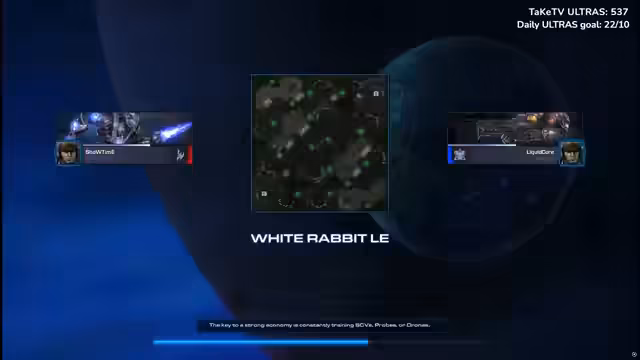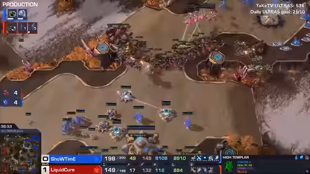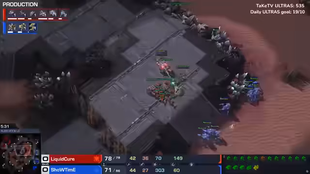 05:31:21Showtime kämpft trotz wirtschaftlicher Überlegenheit (7 Basen) gegen Cures Armeezuwachs, verliert aber wichtige Kämpfe durch Stürme und Liberator-Positionierung. Trotz temporärer Mineralienbank von 9000+ gelingt es ihm nicht, Cures Army entscheidend zu schwächen. Ein Server-Lag erschwert die Situation zusätzlich, bevor Showtime nach 40 Minuten doch noch den Sieg erringen kann.