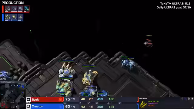 05:22:18Die erste Map zwischen Showtime und Cure entwickelt sich zum taktischen Duell. Showtime errichtet fünf Basen gegenüber Cures drei, nutzt jedoch seine ökonomische Überlegenheit zunächst nicht aggressiv. Cures Viking-Liberator-Ghost-Armee kontrolliert die Map, während Showtime auf Koloss-Archon-Composition setzt. Ein kritischer Basetrade-Versuch von Cure scheitert, doch Showtime verliert zeitgleich Expansions. Die Partie bleibt bis zum Late-Game ausgeglichen.
