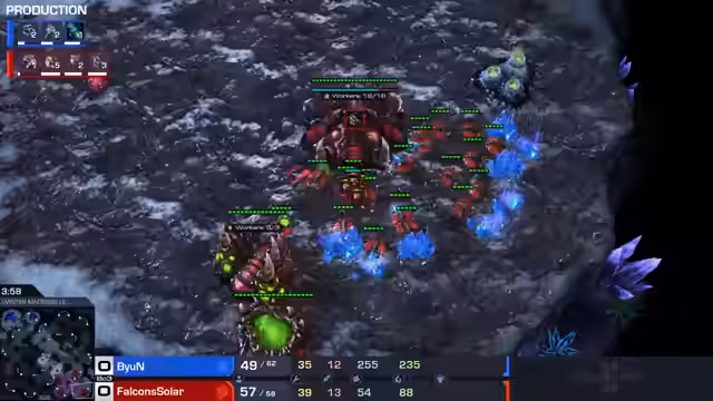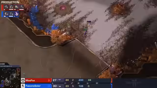 02:40:37Nach einer kurzen Pause wird das Format der Seeding-Gruppe erläutert: Sie bestimmt die Platzierungen für das obere Turnierbracket. Sieger der Gruppe landen im Halbfinale des Upper-Brackets, Zweit- und Drittplatzierte in der Achtelfinalrunde. Es folgt das Spiel zwischen Solar (Zerg) und MaxPax (Protoss). Solar startet nach zwei Niederlagen (gegen Classic und Björn) mit 0:2 in die Gruppe und muss gewinnen, um seine Chancen auf eine gute Platzierung zu halten. MaxPax hingegen kann mit einem Sieg die Gruppe anführen.