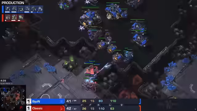 01:02:40Das nächste Match ist Björn (Terran) gegen Classic (Protoss). Der Streamer erklärt kurz die Grundlagen von StarCraft für neue Zuschauer: Start mit 12 Workern, Ressourcen (Mineralien und Gas), Basisaufbau und Army-Produktion. Classic baut aggressiv mit zwei Proxy-Racks (Marauder), während Björn defensiv expandiert. Nach einem intensiven Kampf mit vielen Workerverlusten auf beiden Seiten gewinnt Björn das erste Spiel durch eine starke Positionierung mit Tanks und Bunkern. Der Streamer lobt Björns defensives Spiel.