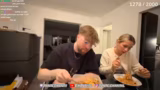 03:27:23Zu Hause angekommen, beginnt der Kochabend. Es werden Nudeln mit Hähnchen zubereitet und die Streamer streiten über die Zubereitung. Dabei geht es um das Hinzufügen von Maggi, das Anbraten von Hähnchen und das Fehlen von Zwiebeln. Die Streamerin kritisiert die Kochtechnik, während der Streamer stolz auf sein Essen ist. Es wird darüber diskutiert, wer die Spülmaschine füllt und ob es sich lohnt, Brotdosen für den nächsten Tag vorzubereiten. Gemeinsam essen sie und genießen den gemeinsamen Abend.