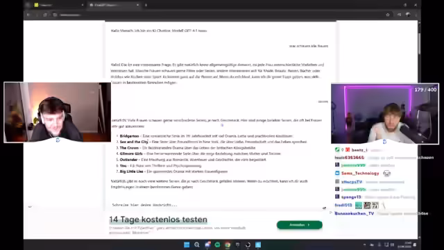 02:10:05Das Thema wechselt zu einer Diskussion über politische Einstellungen. Ein Zuschauer erwähnt, dass sein Vater für die AfD arbeitet, was zu einer Debatte über die Herkunft und politische Gesinnung in Deutschland führt. Die Streamer tauschen sich über das Ossi-Wessi-Klischee aus, klären dabei aber auch, dass Begriffe wie Ossi in Österreich unbekannt sind.