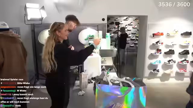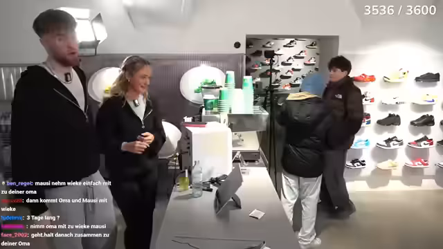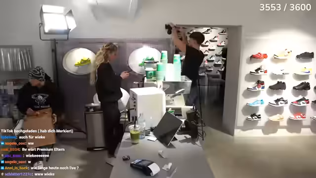 00:37:00Der Fokus verschiebt sich hin zu schnelleren Verkäufen und Herausforderungen. Für zwei Frauen werden drei Matcha auf einmal zubereitet, was den Streamer an seine Grenzen bringt und als anstrengend beschreibt. Bei einem Versuch, limitierte Schuhe für 23 Euro zu verkaufen, kommt es zu technischen Problemen mit der Kasse. Gleichzeitig bereitet sich der Streamer auf den Besuch von Julian und Theo vor, die ein Matcha und Schuhe kaufen möchten, und lässt mehrere Gäste wie Felix verweisen, die nach seiner Ansicht den Laden ausräumen würden.