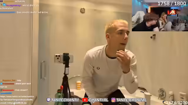 01:00:10Der Stream konfrontiert Theo mit der Frage, ob er sich jemals rasiert hat, und kommt zu dem Schluss, dass dies nicht der Fall sei. Daraufhin beginnt eine Live-Demonstration, bei der Theo mit einem Nassrasierer über seinen Bart gestrichen wird, was ungewöhnlich aussieht und im Chat für Aufregung sorgt. Der Streamer nutzt dies, um Werbung für Rasierprodukte zu machen und argumentiert, dass es für Frauen ein Anzeichen von Fürsorge sei. Im Hintergrund gibt es immer wieder technische Probleme mit der Bildschirmübertragung und Verbindung.
