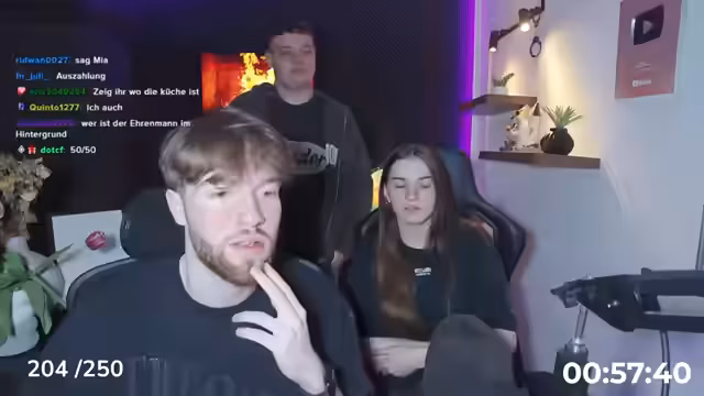 00:05:06Marlon erklärt das Format des Streams: "Eine Stunde ehrlich sein", bei dem Zuschauer über Discord alles fragen können und sie ehrlich antworten müssen. Als Konsequenz für Unehrlichkeit droht Marlon, Selina zu verlieren, während Selina die Küche in der neuen Wohnung riskieren würde. Die Stimmung bleibt locker humorvoll, trotz der angedrohten 'Bestrafungen'.