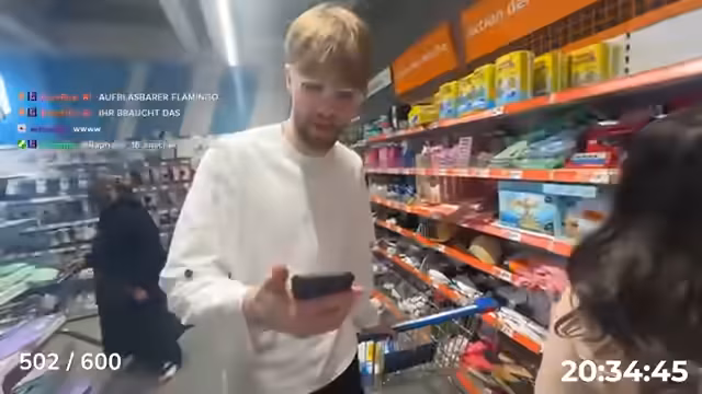 20:19:58Der Streamer startet eine Einkaufstour mit einem Budget von 100 bis 200 Euro, um sein Stream-Zimmer aufzupeppen. Gemeinsam mit Freunden werden diverse Deko- und Partyartikel wie ein Planschbecken, eine LED-Leiste, ein Basketballkorb, ein Fußballtor und ein Hello Kitty-Ball ausgewählt. Der Kauf soll demnächst per Stream übertragen werden.