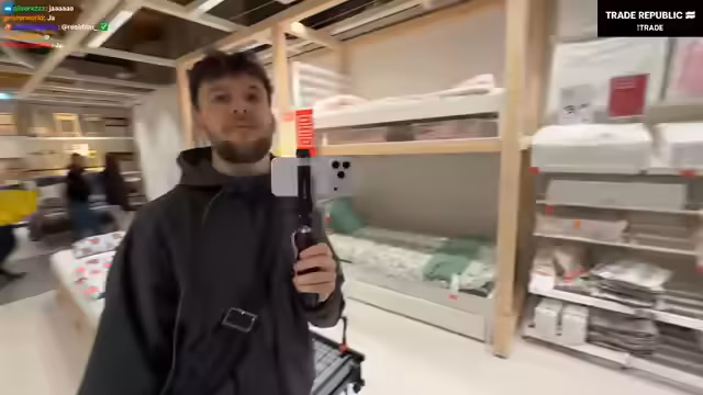 03:16:11Die Gruppe begibt sich in ein IKEA-Möbelhaus, um Gegenstände für das Haus zu besorgen. Dort kommt es zu einer Reihe von unkoordinierten und chaotischen Aktionen. Dazu gehören das Verlieren von Mitgliedern, das Bestellen von sehr großen Mengen an Hotdogs und das anschließende Bezahlen, wobei explizit darauf hingewiesen wird, nicht für "die Bitches" bezahlen zu wollen. Auch zufällige Begegnungen und Mikrokonflikte, wie das Zeigen des Mittelfingers durch eine unbekannte Person, sind Teil des Streams.